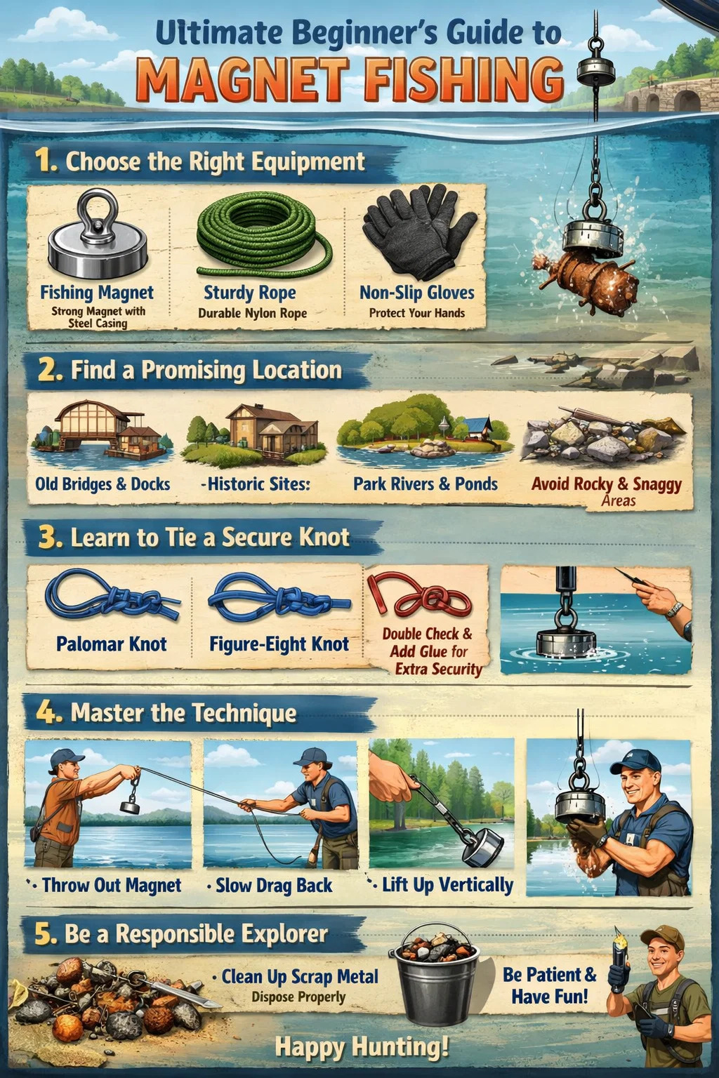 Å prøve ut magnetfiske er faktisk veldig enkelt; du trenger ingen avansert fysikkkunnskap eller eksepsjonell styrke. Så lenge du er nysgjerrig på undervannsverdenen, kan du enkelt komme i gang ved å følge disse trinnene: